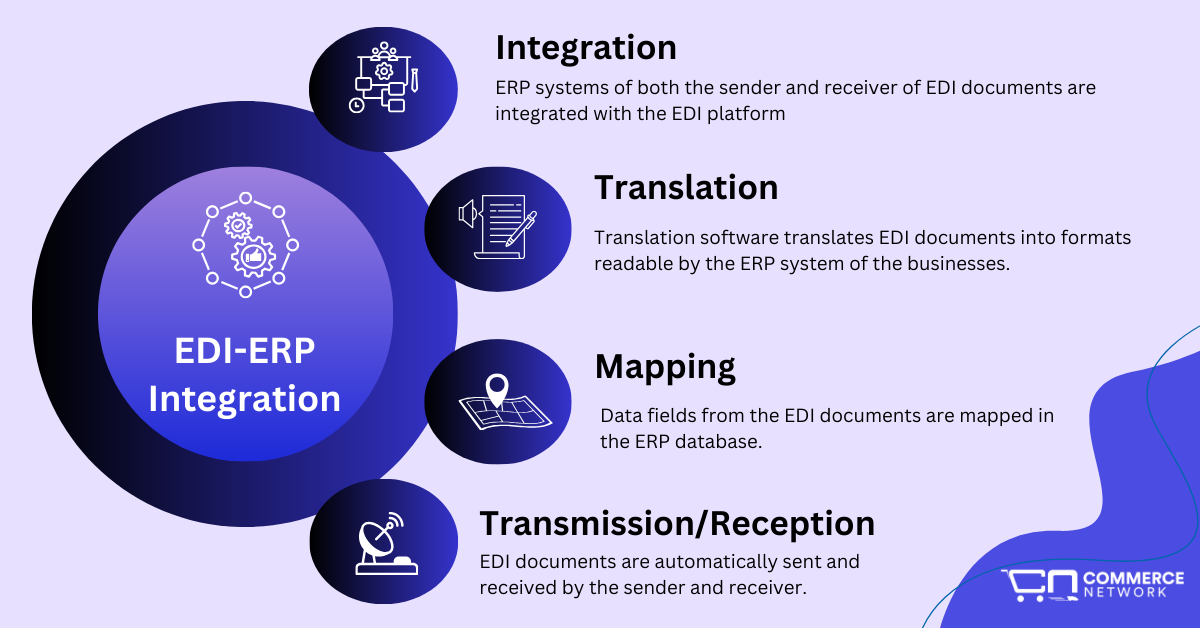 EDI document integration with ERP systems facilitates automated data transfer, reducing manual data entry, gives real-time visibility for information like purchase order status, shipment status, and invoices, and provides a secure method of communication,